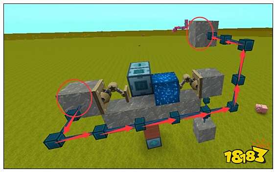 6、如下图,在靠电石块这边的推拉臂后面放上一个岩石,然后往下接电能线,电能线下再接一个岩石,岩石上放上一个触碰按钮,高度自定,到时候这里就是电梯上升时的按钮;