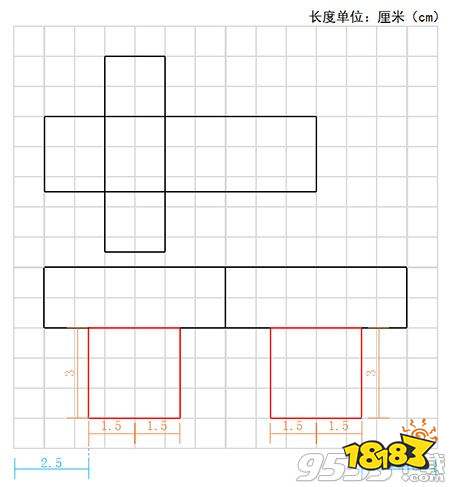 在上一步完成的长方形下方、画两个长3厘米高3厘米的方形