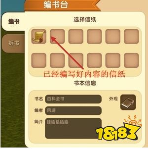 小伙伴们可以根据自己的喜好,编写书名,作者以及书的内容简介。另外如果小伙伴们如果想修改书的内容或者回收信纸,我们可以使用编书台的拆书功能,将书本拆成与合成等份的信纸。