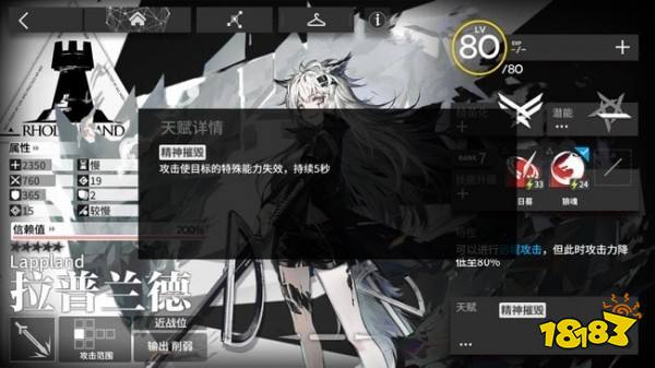 天赋:拉普兰德的面板是平平无奇,但是她的天赋是全游戏独此一位的德克萨斯做得到吗神技——攻击附带5秒(精一1秒,升潜后6秒)的沉默效果。这个能力配合上拉普兰德的远卫射程和对空能力,什么毒爆虫红锤哥霜冻无人机统统都是白板一个,在推图、攻坚中均有优异表现。可以说这个沉默技能是不少难点的解决逃课方案。不过拉普兰德并不能沉默敌方BOSS的能力,所以打BOSS还是得硬上。