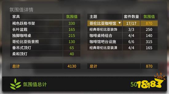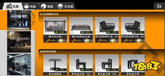 套装家具虽然购买价格昂贵,可能还需消耗源石,但相对应的氛围值提升也是很高的,如果不太追求美观,可将每套的中型家具——桌椅、墙纸一类不太贵又有较高氛围值的家具买下,进行混搭。