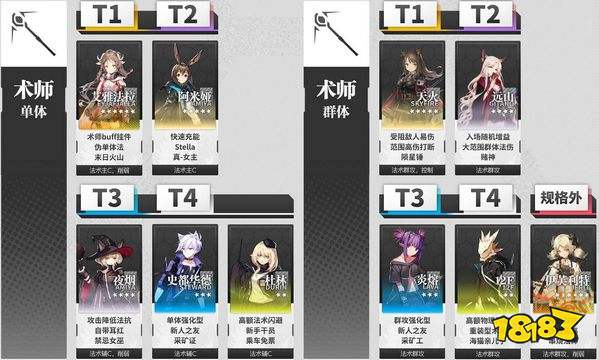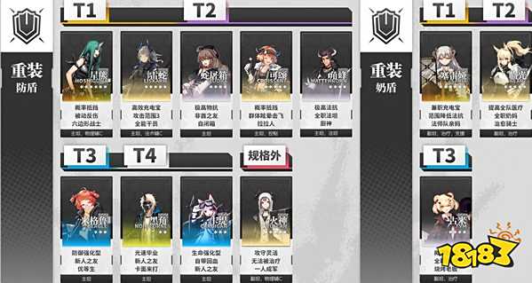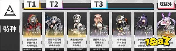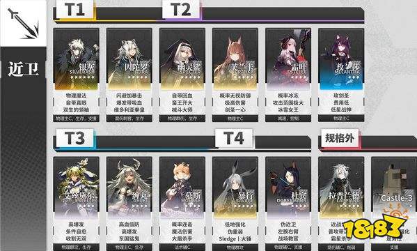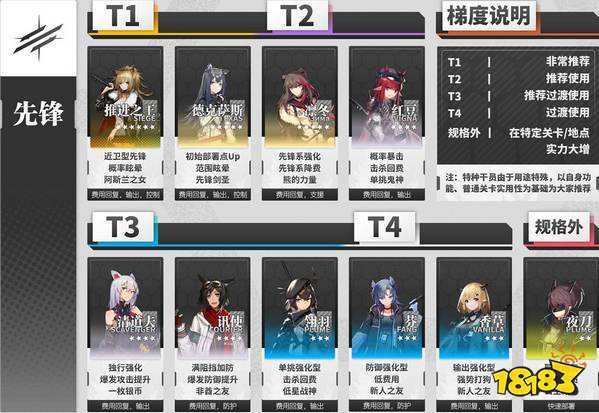 T1:非常推荐;T2:推荐使用;T3:推荐过渡使用;T4:过渡使用;规格外:在特定关卡/地点实力大增