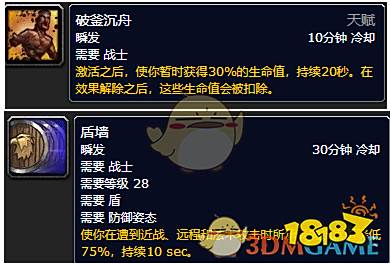 最后,请各位牢记,当时的破釜沉舟是获得30%生命值,冷却时间10分钟;盾墙是75%减伤,但是CD长达30分钟;反击风暴的冷却时间也长达30分钟。新版本玩惯了是不是觉得当时的防战真的弱了点……