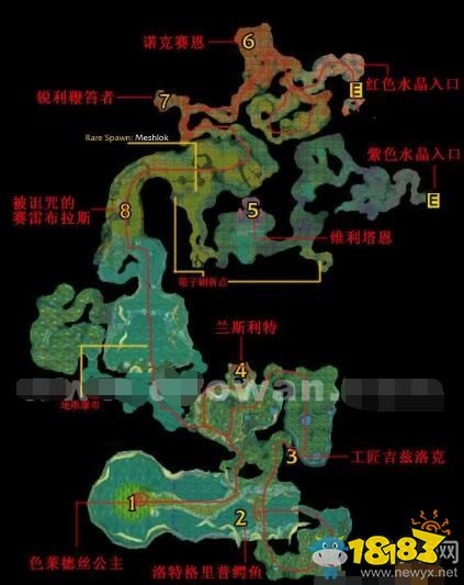 这一仗如果问题不大,那么应该说队伍的配合没有什么问题了。之后小心推进,都是3个一组的花,沿途治疗植物,另外,水晶雕刻也在收集中了吧。第四可汗也在这里散步,可说是收获多多吧。很快来到诺克赛恩的洞穴。建议此时猎人开上(野性强化,+40自然抗性),同样的办法清除掉所有恶蛆,然后在这个洞的开阔地带布局准备对付这个剧毒的boss-诺克赛恩(地图上的6号位置)。