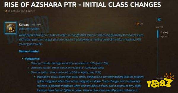 开发人员说明:与其他坦克相比,复仇专精的主动减伤技能处于冷却时,他们需要处理减伤能力较低的问题。这些改动将大幅提升恶魔尖刺冷却时的物理减伤能力,而在恶魔尖刺激活时略微提高减伤能力。对于魔法伤害也有一些总体的被动减伤。总体而言,复仇专精受到的持续性伤害将有所降低,恶魔尖刺冷却时的脆弱期将有所减少。
