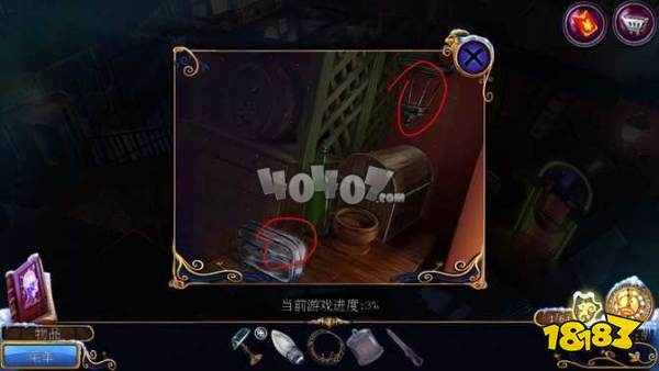 10、点击餐厅中间桌子,点击包,对拉链使用胸针,得到棉签和指甲锉。对右上使用灯泡,照亮后看到左侧酒桶,点击得到门环。再次前往广场。10x
