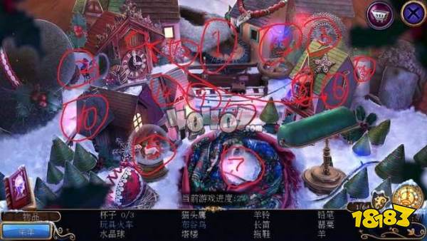 8、依照图中顺序进行点击,注意:6处钥匙拖到箭头所指松手,点击得到布谷鸟。9处上方红白相间的是铁道栏杆,使用后拦住火车,得到火车。最后点击右下方灯,得到灯。8x