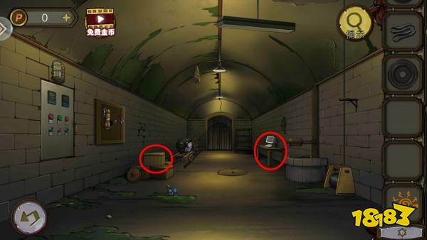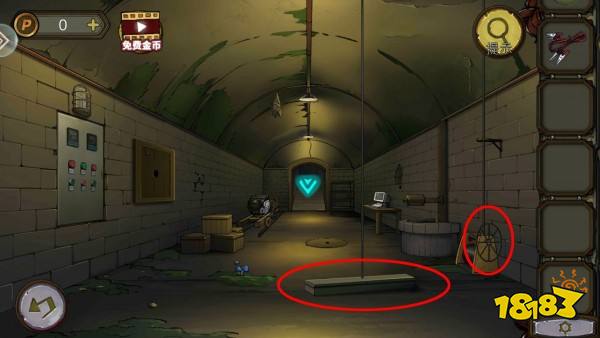 红、绿按钮放机关上,点亮所有按钮,开启防空洞的灯。拿车轮,墙上拿到钥匙、绳子和电线。