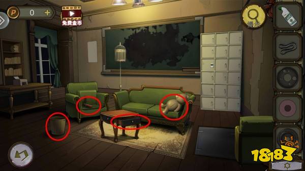 电瓶和电线组合,打开中间的门。根据线索,打开台子的机关,拿到钥匙。椅子拿到铁钩。