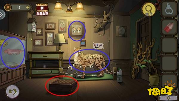 根据豹子、蝴蝶和鱼缸里的眼睛图案,打开盒子,拿到电池。