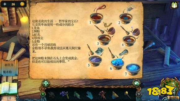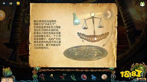 把镜片和托盘都放到右边的天平秤上[镜片、托盘消失],再放入铜钱[铜钱消失],根据在炼金塔大厅左边桌子上的图纸提示,挪动铜钱,使镜片发光,把烧杯放到光源上[烧杯消失],得到:月神泪(炼制魔术粉的材料之一②,共6种)。