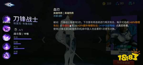 他的一技能是向前冲刺一下,并对路径上的敌人造成大量的物理伤害,如果这个一技能成功击杀敌人的话,或者是目标单位的话,就可以立马刷新一技能的cd。他的二技能是向周围旋转一周,如果命中敌方单位的话,会给自己回复少量的血量,然后可以再次激活二技能,再可以使用一段就会触发下一次强化普通攻击。