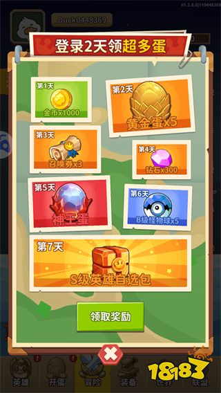 每日登录即可领取丰厚奖励,包括第1天金币、第2天黄金蛋、第4天钻石等核心资源。其中,第7天可获得S级英雄自选包,是前期构建核心战力的重要来源,务必不要错过。