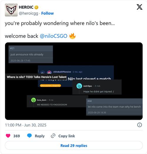 HEROIC俱乐部官方宣布,20岁瑞典选手nilo正式回归主力阵容,标志着这支国际战队完成夏季转会期的阵容重组。nilo的回归填补了xfl0ud离队留下的空缺,为HEROIC带来新的战术可能性。