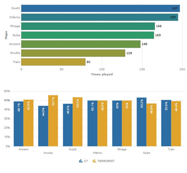 Dust2以微弱优势领先Inferno,成为上半年登场次数最多的地图。这一结果印证了这张经典地图在CS2时代的持续影响力。值得注意的是,Train仅登场80次,成为最不受欢迎的地图。