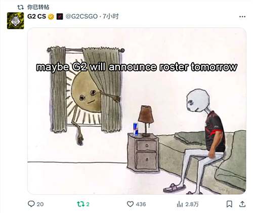 G2官方在社交媒体发布动态:"或许明天会官宣?"战队经理peca在评论区回应"或许吧",进一步确认了阵容即将公布的消息。这种吊胃口的营销方式引发粉丝热议,虽然部分粉丝表示"无人在意",但更多CS爱好者对这支传统强队的重建充满好奇。
