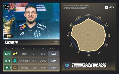 KSCERATO凭借稳定表现首次获得MVP奖项,他在防守方的1.33rating尤为亮眼。molodoy以年轻狙击手的惊艳发挥获得EVP,在决赛带病出战仍打出17-2的惊人表现。yuurih以1.20的赛事最高rating位列第三,而NAVI的makazze和The MongolZ的Senzu分列四五位。Senzu虽已离队,但在季军赛中以79杀、99.8ADR的完美表现为蒙古之旅画上句号。