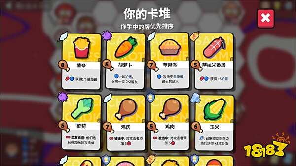 最重要的是那种一张卡片有三种用途的玩法:你可以把食物卡牌用来攻击敌人、吃掉恢复自己并获得护盾,或者放在空地用来移动。这种多功能性让每张卡牌都有多种策略选择,增加了游戏的深度和趣味性。