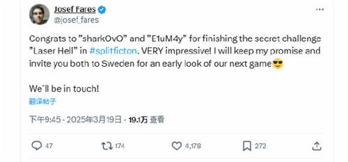 《双影奇境》制作人Josef Fares今日在社交媒体证实,中国玩家组合"E1uM4y"与"鲨鱼-v-"以1小时17分18秒的成绩,成为全球首通隐藏关"激光地狱"的玩家。该关卡因超高难度被称为"手残玩家噩梦",其通关视频在B站播放量已突破500万次。
