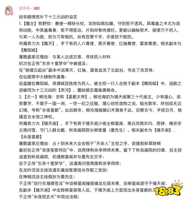 在《十三元凶:生死弈》PV发布后,大量玩家自发解析剧情、推测未来走向,形成良好的社区互动氛围。有玩家甚至详细梳理了已登场的十三元凶及其设定,为其他玩家提供参考。