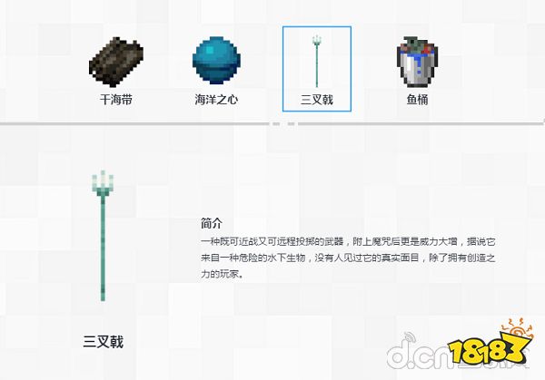 游戏玩法也发生了变化,最直观的便是方块种类的增多(干海带快、蓝冰、珊瑚块等),它们都能作为材料使用。另外,道具也变得更加丰富,海洋之心、三叉戟、鱼桶都能为海洋探索带来便利。你还能为三叉戟施加全新附魔(穿刺、引雷、激流等),有效提升探索效率。总的来说,海洋更新中的内容相当丰富,需要耗费一定的时间进行研究。