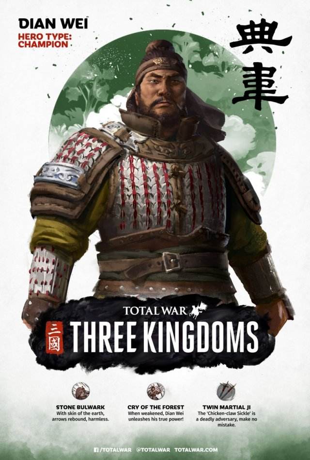 日前,《全面战争:三国》官方公布了曹魏势力的武将典韦的海报,角色高大魁梧,身披铠甲,神情肃穆,令人心生敬畏。