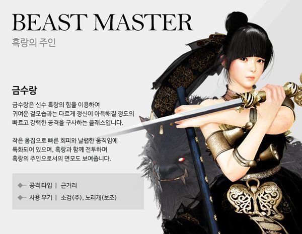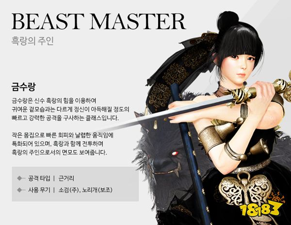 驯兽师是款使用短剑和挂饰进行攻击的近战职业。跟以往的《黑色沙漠》职业不同,驯兽师可以召唤神兽“黑狼”并肩作战。在游戏中,可以看到驯兽师使用短剑的快速攻击,和骑在黑狼上跟敌人作战的场面。