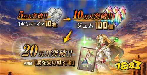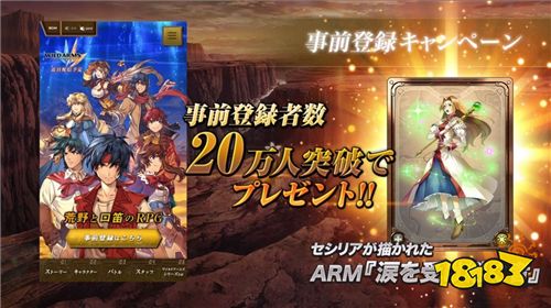 在官方自即日起正式展开的预约注册活动方面,目前宣布,将会视预约玩家人数赠送包括「钻石×100(10 万人特典)」等好礼让玩家们领取,而且一旦预约人数突破20 万人,还将会赠送以系列作一代女主角「赛希莉亚(セシリア)」图像为主题设计的限定稀有ARM「眼泪继承者(涙を受け継ぐ者)」作为特典奖励,玩家们不妨现在就赶快先上官网申请预约吧!