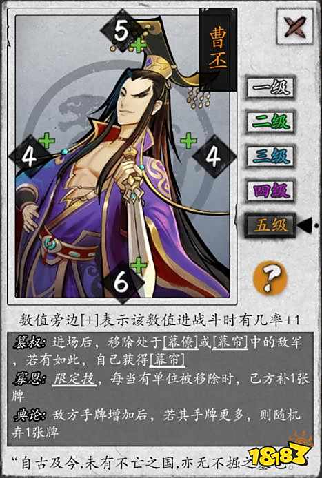 五级:【篡权】:进场后移除处于【幕僚】或【幕帘】中的敌军,若有如此,自己获得【幕僚】(【揽权2】升级)