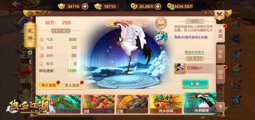 《热血江湖手游》坐骑免不了幻化功能,机缘巧合下仙鹤坐骑也可幻化成猫头鹰和神机飞鸟,与其他坐骑相比,仙鹤幻化外形发生翻天覆地的变化,真不敢相信他们本是同宗,神机飞鸟颇有鲁班木飞鸟永不降落的气场。既然是仙家坐骑,基础的移动速度自然了得,1200的移动速度还是相当给力的,初始气血值表现也很亮眼。