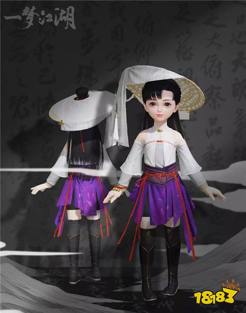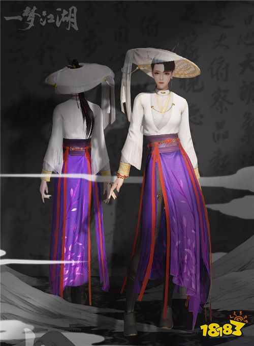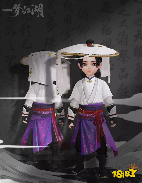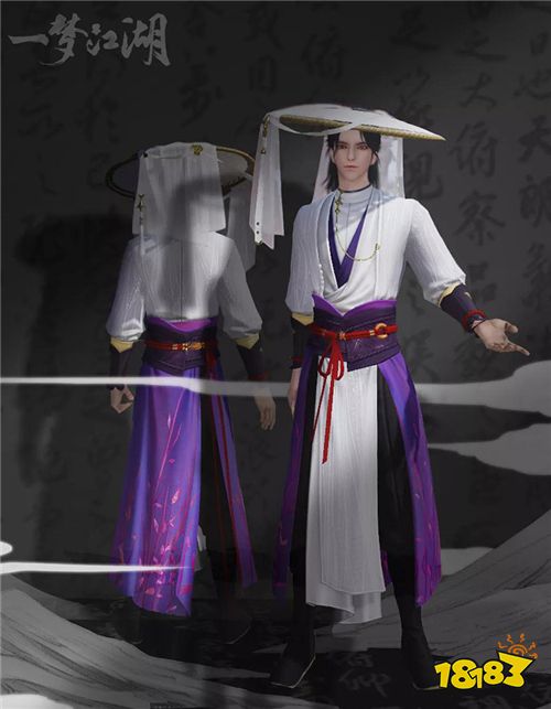 “山语霞”一身白紫配色,加上新款斗笠,诠释江湖中人人相传的世外高人形象。白纱覆于斗笠边沿,自然垂落赋予玩家神秘色彩,样式简约却不简单。成男还有链状配饰衔接领口与衣边,增加了一丝华贵设计。