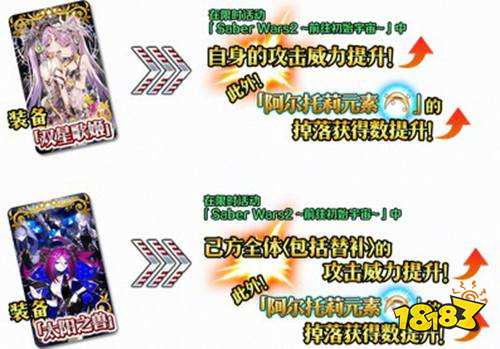 装备在活动中获得的限定概念礼装「★5(SSR)双星歌姬」和「★5(SSR)太阳之兽」,还可提升活动道具「阿尔托莉元素」的掉落获得数,并获得自身攻击威力提升或己方全体(包括替补)攻击威力提升的效果,进一步¬提高活动攻略效率!