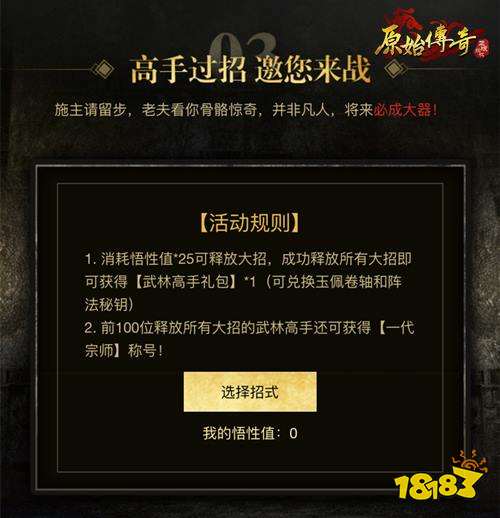 (1)消耗悟性值*25可释放大招,成功释放所有大招即可获得【武林高手礼包】*1(可兑换玉佩卷轴和阵法秘钥)