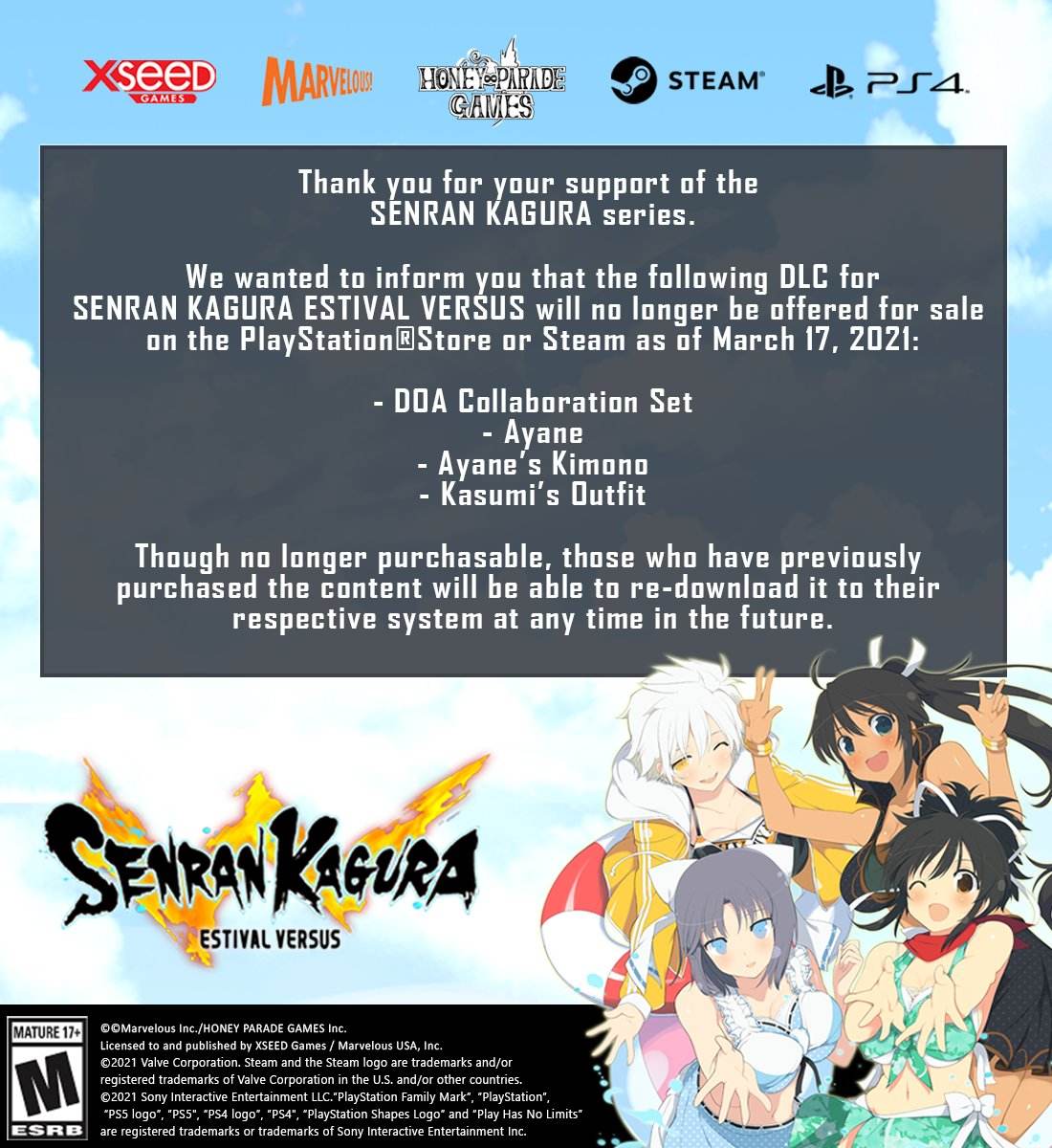 来自游戏发行商Xeed今日(3月16日)公布的最新消息,PS4/Steam平台上《闪乱神乐:少女们的选择(SENRAN KAGURA ESTIVAL VERSUS)》联动《死或生》的多款DLC即将下架。