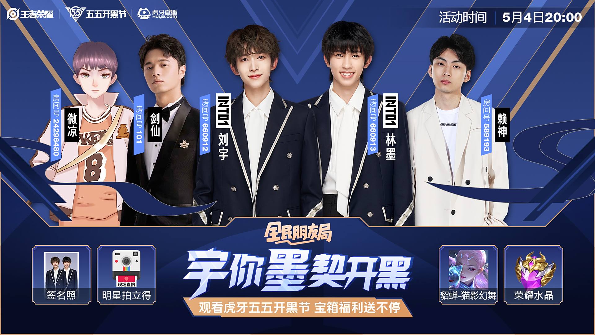 本次虎牙五五开黑节虎牙迎来了INTO1的成员林墨与刘宇俩位人气明星嘉宾,他们将在5月4日的活动直播间中与虎牙主播王者荣耀人气主播剑仙、赖神、微凉一起开黑王者荣耀,同时完成官方指定的任务挑战,帮助大家解锁更多福利,本次活动奖品非常丰富!有明星签名照、荣耀水晶、传说皮肤、明星拍立得等APP专属宝箱福利送不停。
