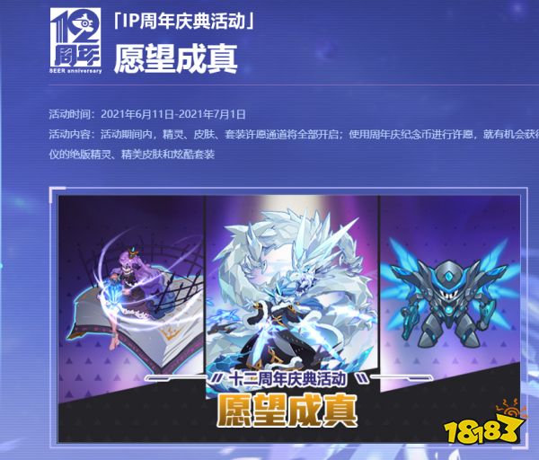 活动内容:活动期间内,使用周年庆纪念币兑换精灵、皮肤、套装的许愿单,然后选择自己尚未获得的精灵、皮肤、套装进行许愿,即有机会获得它们!