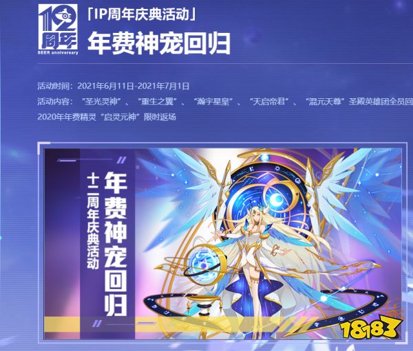 活动内容:“圣光灵神”、“重生之翼”、“瀚宇星皇”、“天启帝君”、“混元天尊”圣殿英雄团全员回归;2020年年费精灵“启灵元神”限时返场