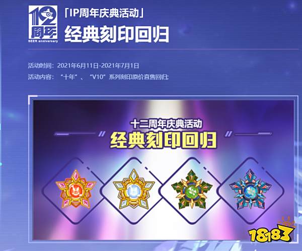 被玩家津津乐道的“十年、V10”系列刻印将在本次周年庆中,以原价直售的方式回归!在十年系列刻印中,“十年·筑梦”及“十年·磨砺”凭借其顶级的速度加成属性,能够使精灵在对局中先发制人。而V10系列刻印中,“05、06”号刻印增加超高的体力属性,可以使高体力肉盾型精灵更加“皮糙肉厚”。