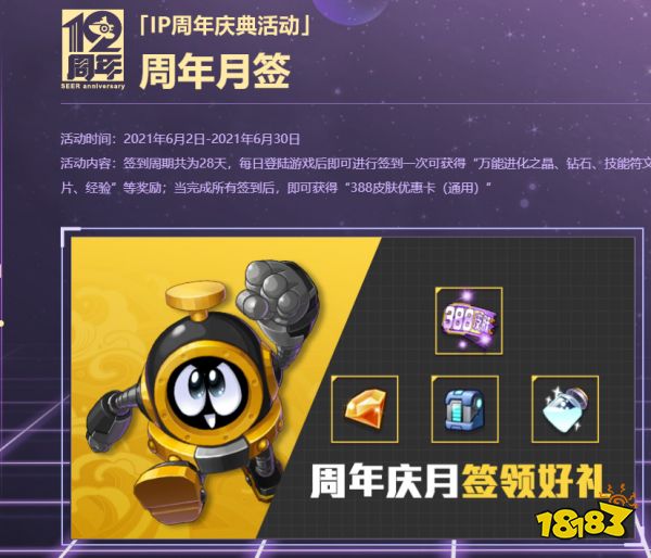 活动内容:签到周期共为28天,每日登陆游戏后即可进行签到一次可获得“万能进化之晶、钻石、技能符文碎片、经验”等奖励;当完成所有签到后,即可获得“388皮肤优惠卡(通用)”
