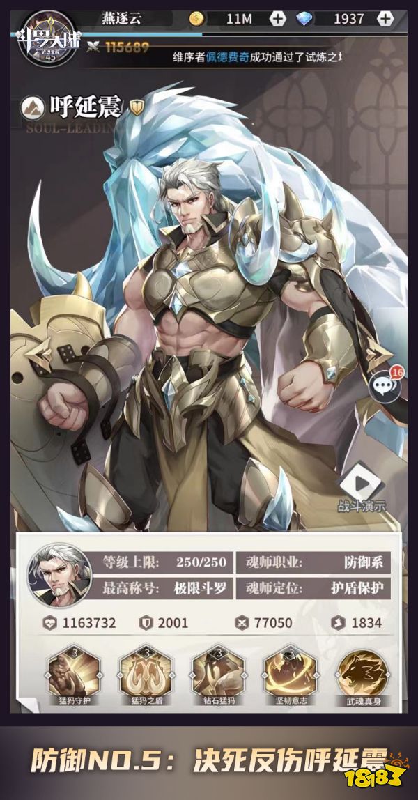 呼延震是《斗罗大陆:武魂觉醒》中兼顾援护与护盾保护的传说级魂师。技能“猛犸守护”属于精准援护技能,在提升我方生命值最低魂师10%免伤的同时分担50%的伤害,并持续2个回合。