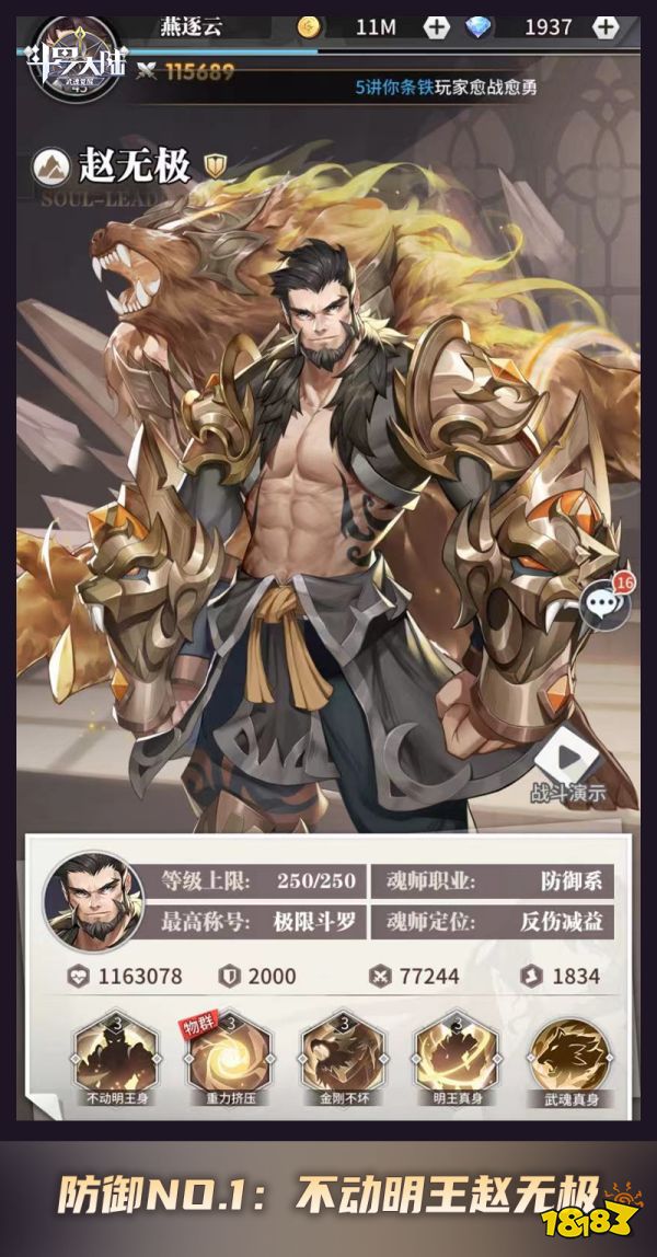 被动技能“金刚不坏”、“明王真身”以及赵武武魂真身都从攻击、防御、恢复,以及治疗效果对赵无极进行了全方位的强化。但能被玩家们称为“赵老师”的赵无极绝对不仅仅只是如此,其主动技能“重力挤压”更是极其强悍的物理群攻技能,三级后对敌方全体伤害高达106%并加五倍防御真实伤害,同时对敌方攻击最高单位附加“重力失衡”减益效果,该单位暴击下降20%,持续两个回合。能攻善守不负不动明王之名。