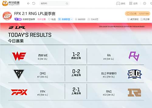 北京时间2021年6月26日,虎牙直播英雄联盟LPL夏季赛常规赛W3D6继续开战。首场WE迎战RA,两支势均力敌的年轻战队贡献一场激情较量,最终凭借iBoy五杀RA击败WE拿下胜利;第二场OMG迎战BLG,虽然天才中单Creme状态神勇,但凭借更加出色的团战执行力BLG翻盘击败OMG;第三场FPX与RNG打响虎牙巅峰德比之战,虽然上路对线小虎连续单杀Nuguri,但状态更加出色的FPX还是鏖战三局击败RNG。