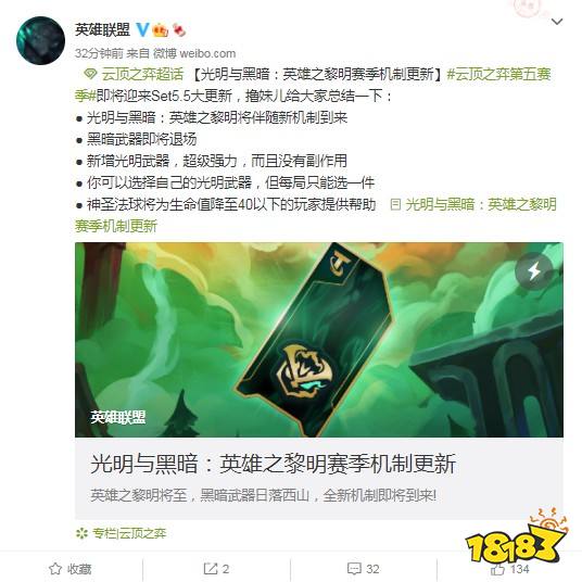 云顶之弈“光明与黑暗:英雄之黎明”赛季机制更新,黑暗武器将退场,超强力无副作用的光明武器即将加入。