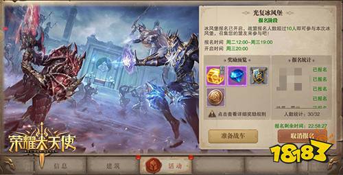 冰风堡作为《荣耀大天使》中的大型PVP跨服竞技活动,在开服第三天和每周六开启。参与冰风堡战场活动可获得当前装备的自选黄金宝箱、钻石等众多奖励。作为需要战盟集体参与的战场活动,切记提前动员战盟成员,每多一人参与胜利便更多一分。