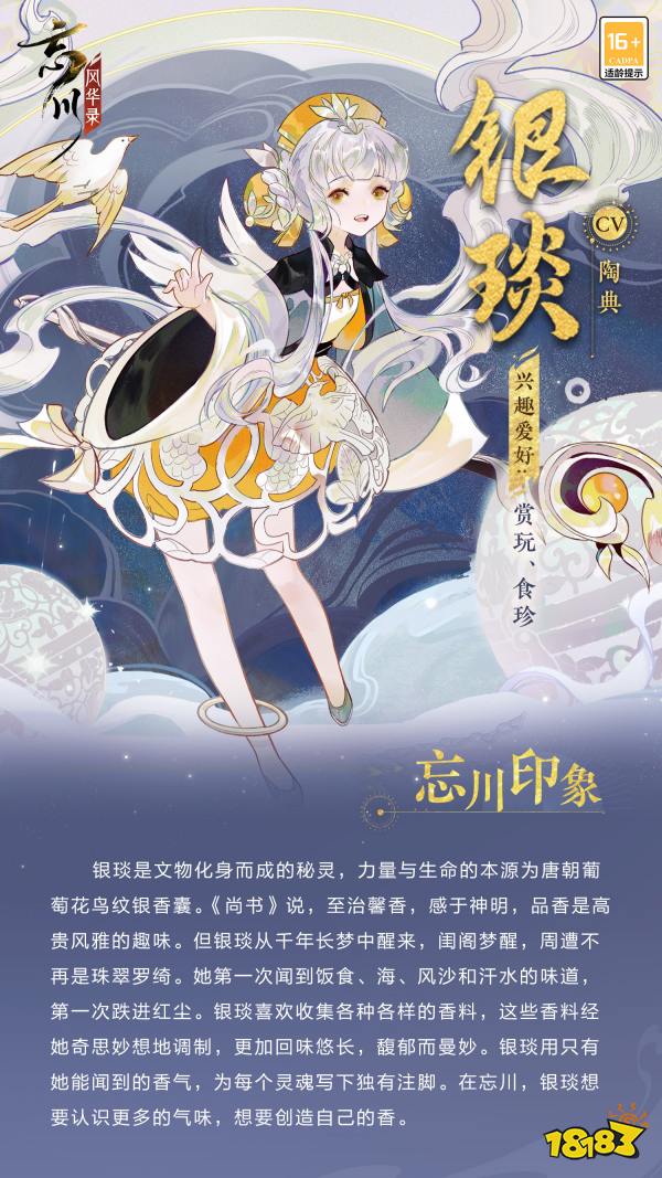 来到忘川,银琰闻到了完全不同于闺阁帐香的气味,红尘世界中的饭食、海、风沙和汗水……每种气味都能让她好奇欣喜。银琰喜欢收集各种不同的香料,经她一番调制,香气更加悠长而曼妙。在忘川,银琰想要体验千百般气味,期待着创造独属于自己的香。