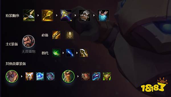 救赎、离子火花、龙牙、狂徒铠甲、+荆棘之甲 都可以,反正是有什么肉装都给他就对了,他就是无畏重炮的保护伞,越肉越好。