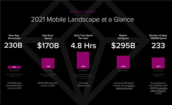另外,2021年,移动应用的用户支出达到1700亿美元,与去年相比增长了19%,下载量以同比5%的速度继续增长,达到2300亿次。