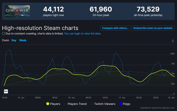 自上周《战神4》PC版发售以来,游戏的销量和在线人数便一直处于排行榜前列,而最高在线玩家数量也在不断的增长,根据Steam数据统计网站Steam DB的显示,《战神4》在发售日当天最高在线人数为6万多人,而在之后这一数据还在不断上涨,现在最高在线人数已经到了73529人。