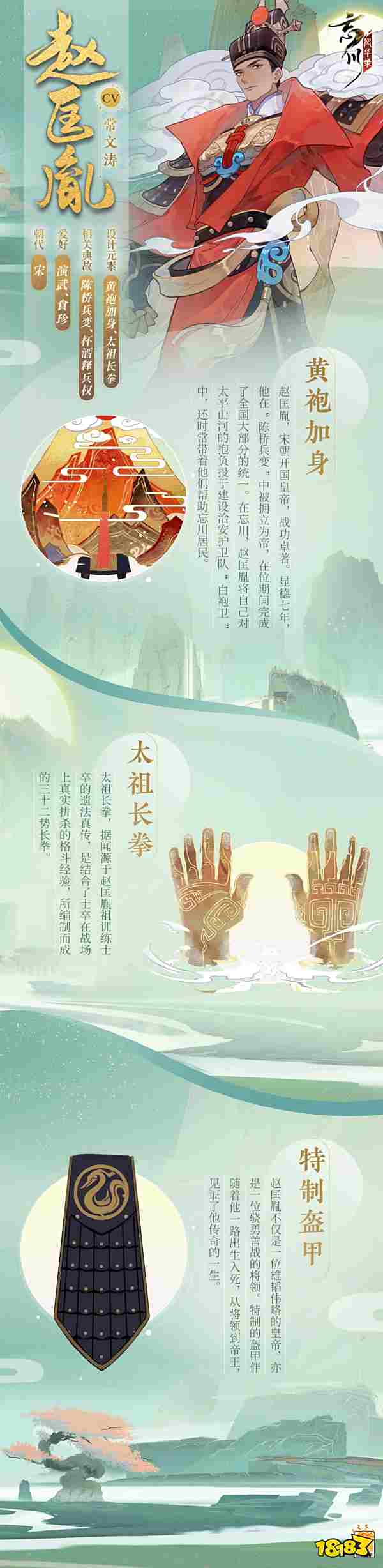我有桃源,故人万千!《忘川风华录》全新天品名士【赵匡胤】即将入住忘川,周年全新版本【福曜周岁】3月10日风华上线,超多免费资源等你来拿!各位玩家“使君”快下载游戏,与千古名士共贺周岁吧!了解更多活动信息,请关注官方自媒体(官方微信公众号、微博@忘川风华录手游)后续新闻。