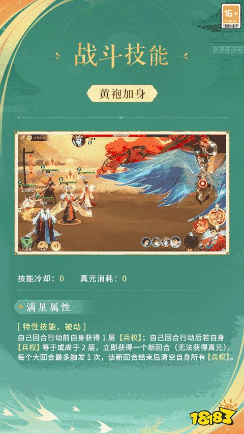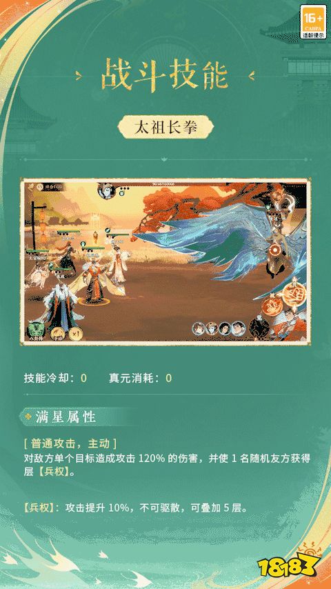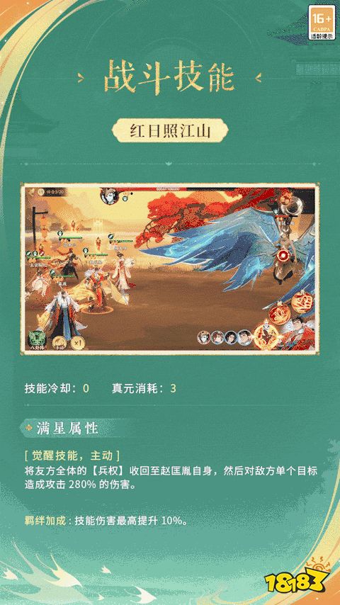 赵匡胤在战斗中作为输出出战!他以技能【太祖长拳】为普通攻击,【黄袍加身】为特性技能,【红日照江山】为觉醒技能,触发羁绊时技能伤害最高提升10%,驯烈马,游四方!